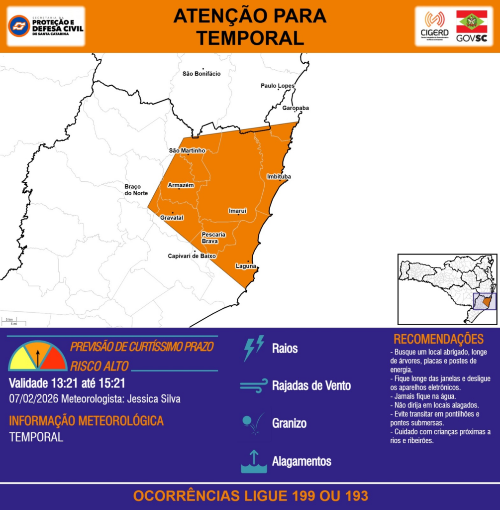 ATENÇÃO – 07/02 13:21 – TEMPORAL com RAIOS, RAJADAS DE VENTO, GRANIZO e ALAGAMENTOS para os municípios de Armazém, Braço do Norte, Capivari de Baixo, Garopaba, Gravatal, Imaruí, Imbituba, Laguna, Paulo Lopes, Pescaria Brava, São Bonifácio e São Martinho nas próximas 2 horas. Ocorrências ligue 199 ou 193.