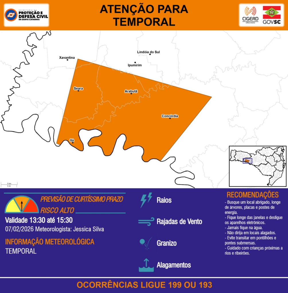 ATENÇÃO – 07/02 13:30 – TEMPORAL com RAIOS, RAJADAS DE VENTO, GRANIZO e ALAGAMENTOS para os municípios de Arabutã, Concórdia, Ipumirim, Itá, Lindóia do Sul, Seara e Xavantina nas próximas 2 horas. Ocorrências ligue 199 ou 193.