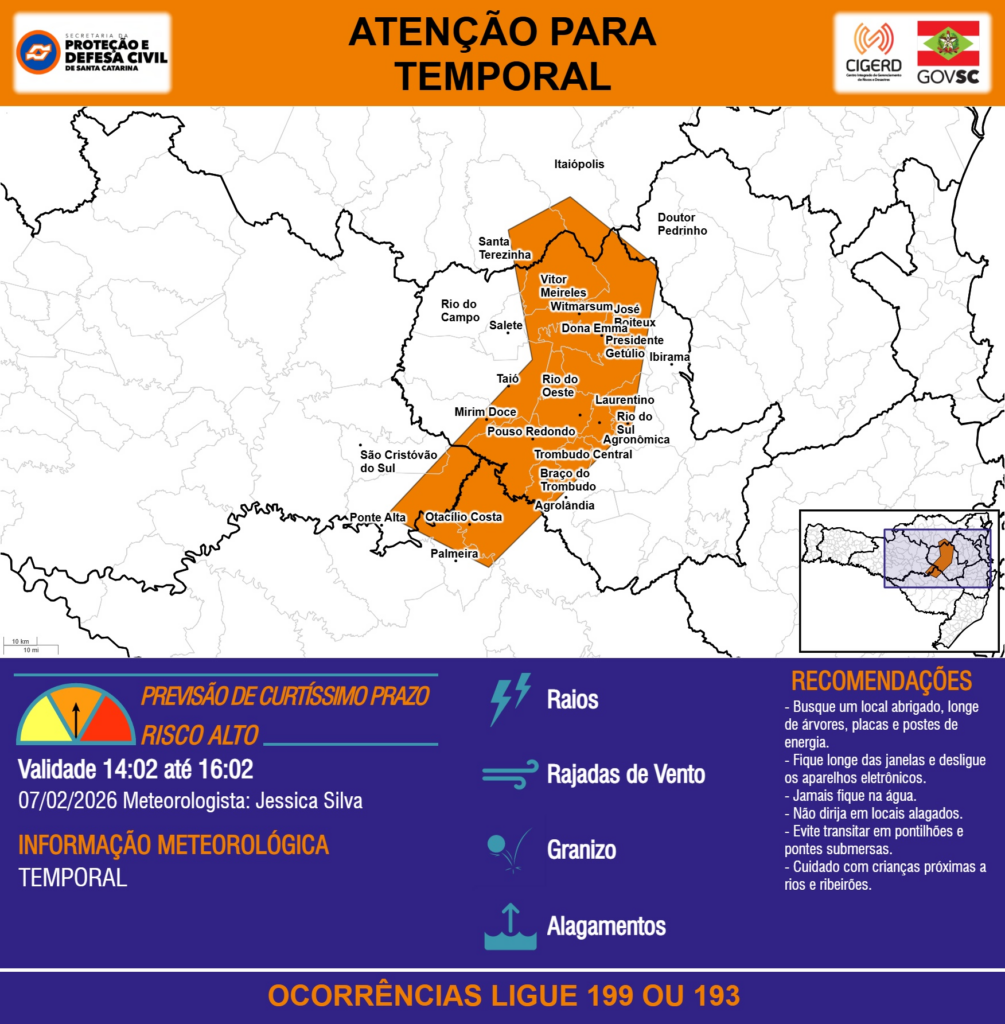 ATENÇÃO – 07/02 14:02 – TEMPORAL com RAIOS, RAJADAS DE VENTO, GRANIZO e ALAGAMENTOS para os municípios de Agrolândia, Agronômica, Braço do Trombudo, Dona Emma, Doutor Pedrinho, Ibirama, Itaiópolis, José Boiteux, Laurentino, Mirim Doce, Otacílio Costa, Palmeira, Ponte Alta, Pouso Redondo, Presidente Getúlio, Rio do Campo, Rio do Oeste, Rio do Sul, Salete, Santa Terezinha, São Cristóvão do Sul, Taió, Trombudo Central, Vitor Meireles e Witmarsum nas próximas 2 horas. Ocorrências ligue 199 ou 193.