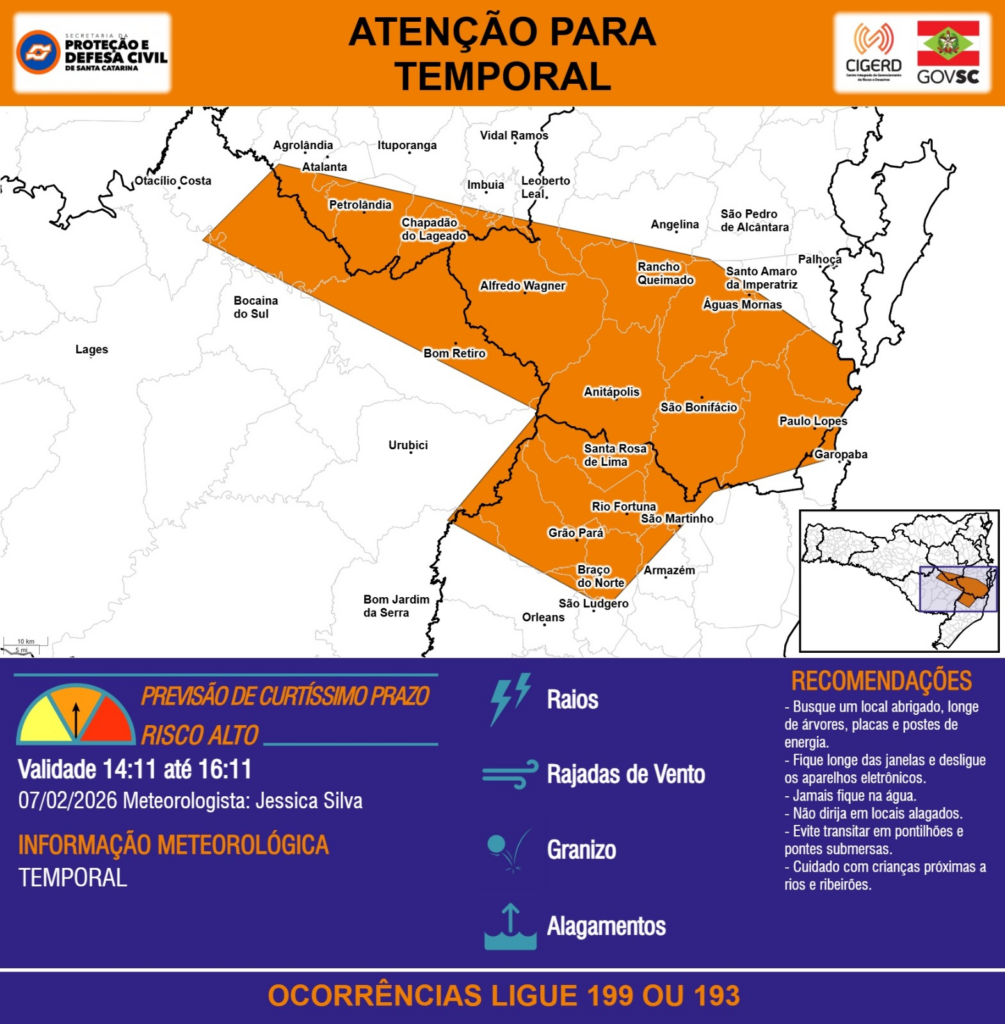 ATENÇÃO – 07/02 14:11 – TEMPORAL com RAIOS, RAJADAS DE VENTO, GRANIZO e ALAGAMENTOS para os municípios de Agrolândia, Alfredo Wagner, Angelina, Anitápolis, Armazém, Atalanta, Bocaina do Sul, Bom Jardim da Serra, Bom Retiro, Braço do Norte, Chapadão do Lageado, Garopaba, Grão Pará, Imbuia, Ituporanga, Lages, Leoberto Leal, Orleans, Otacílio Costa, Palhoça, Paulo Lopes, Petrolândia, Rancho Queimado, Rio Fortuna, Santa Rosa de Lima, Santo Amaro da Imperatriz, São Bonifácio, São Ludgero, São Martinho, São Pedro de Alcântara, Urubici, Vidal Ramos e Águas Mornas nas próximas 2 horas. Ocorrências ligue 199 ou 193.