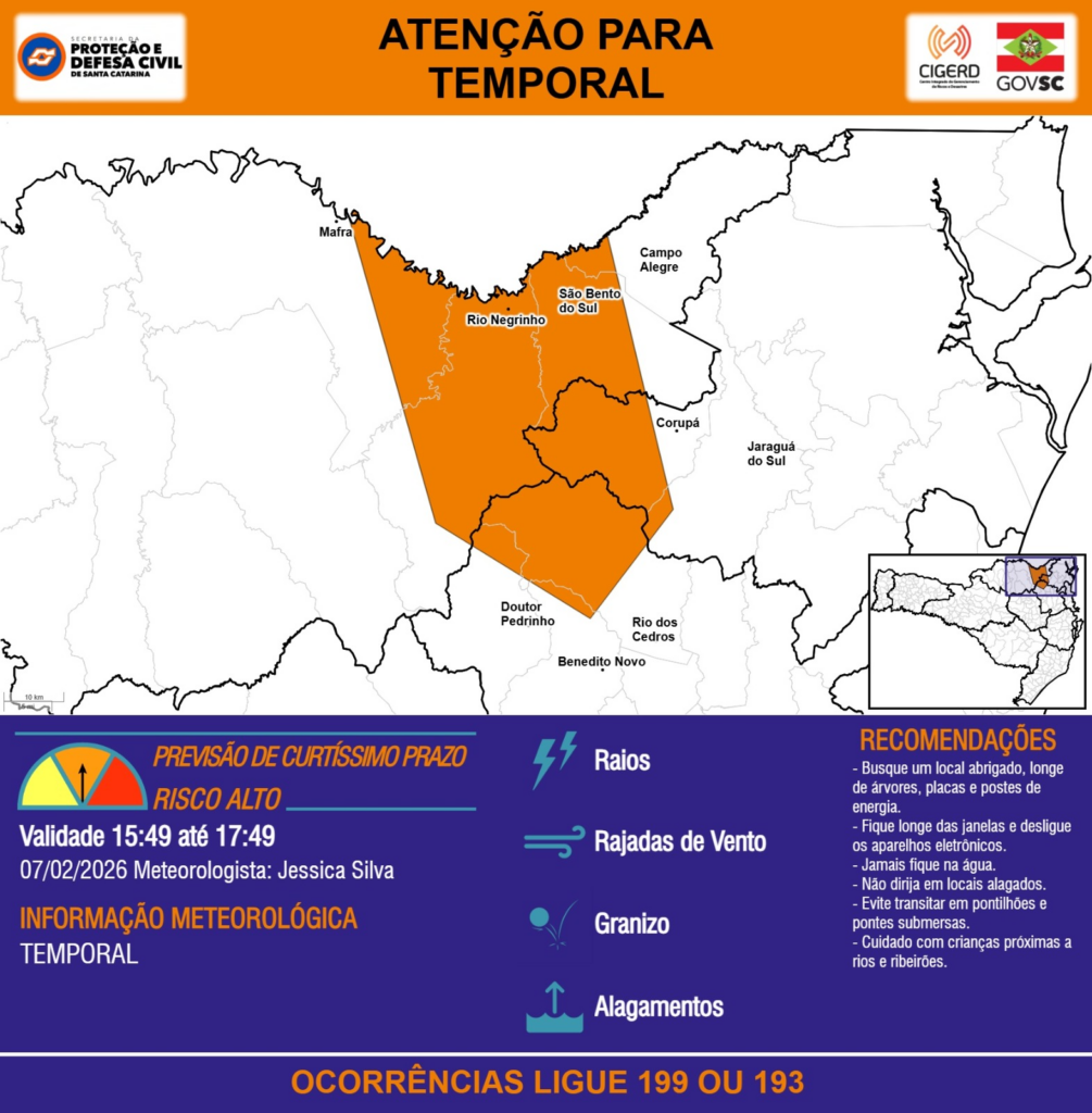 ATENÇÃO – 07/02 15:49 – TEMPORAL com RAIOS, RAJADAS DE VENTO, GRANIZO e ALAGAMENTOS para os municípios de Benedito Novo, Campo Alegre, Corupá, Doutor Pedrinho, Jaraguá do Sul, Mafra, Rio Negrinho, Rio dos Cedros e São Bento do Sul nas próximas 2 horas. Ocorrências ligue 199 ou 193.