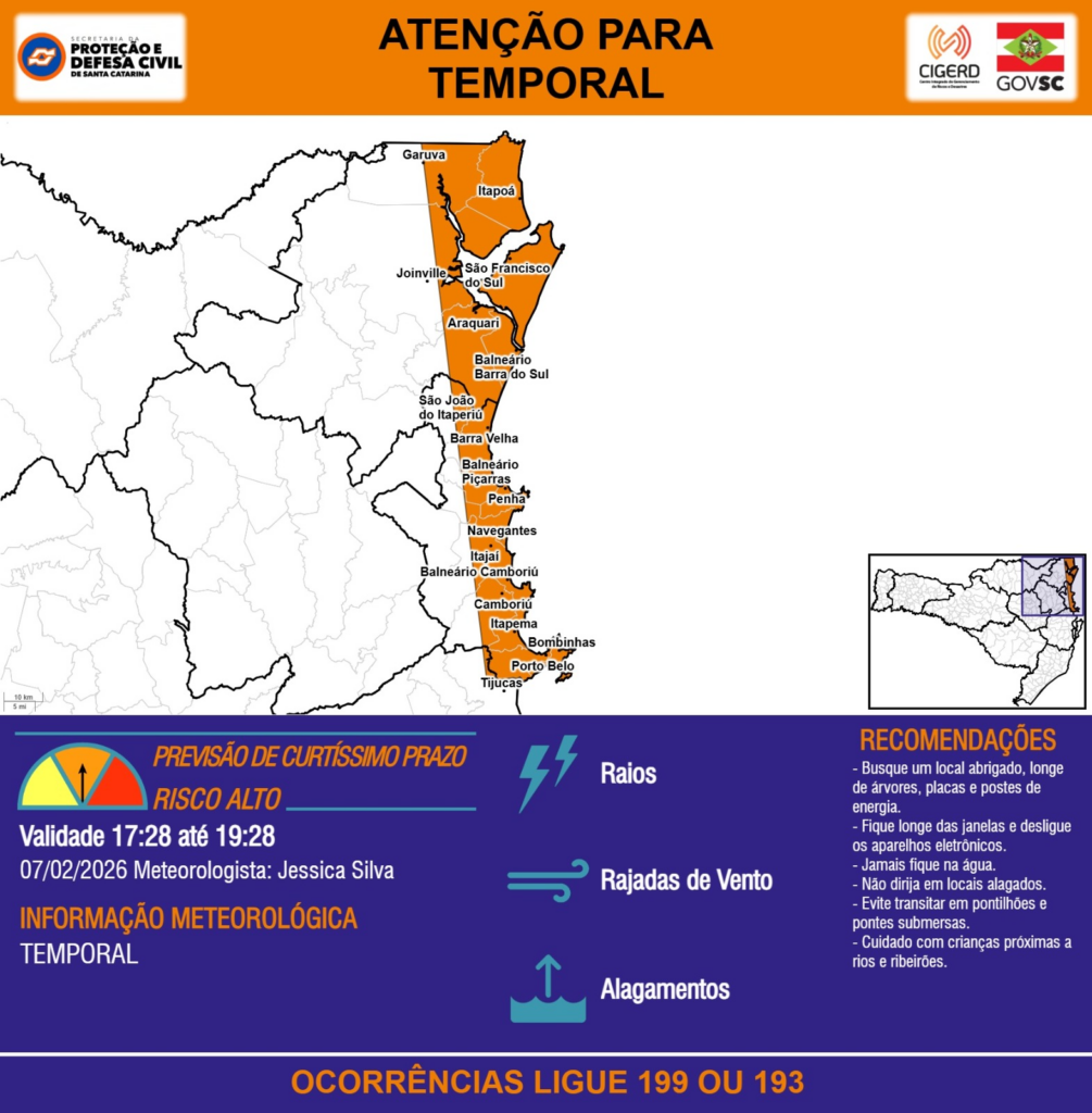 ATENÇÃO – 07/02 17:28 – TEMPORAL com RAIOS, RAJADAS DE VENTO e ALAGAMENTOS para os municípios de Araquari, Balneário Barra do Sul, Balneário Camboriú, Balneário Piçarras, Barra Velha, Bombinhas, Camboriú, Garuva, Itajaí, Itapema, Itapoá, Joinville, Navegantes, Penha, Porto Belo, São Francisco do Sul, São João do Itaperiú e Tijucas nas próximas 2 horas. Ocorrências ligue 199 ou 193.