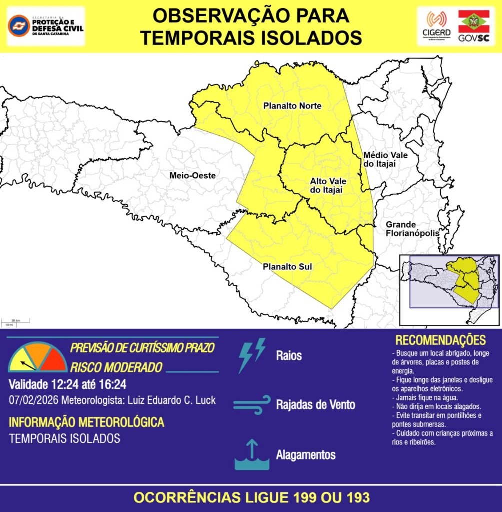 OBSERVAÇÃO – 07/02 12:24 – TEMPORAIS ISOLADOS com RAIOS, RAJADAS DE VENTO e ALAGAMENTOS pontuais para as regiões do Meio-Oeste, Planalto Norte, Planalto Sul, Grande Florianópolis, Médio e Alto Vale do Itajaí nas próximas 4 horas. Ocorrências ligue 199 ou 193.