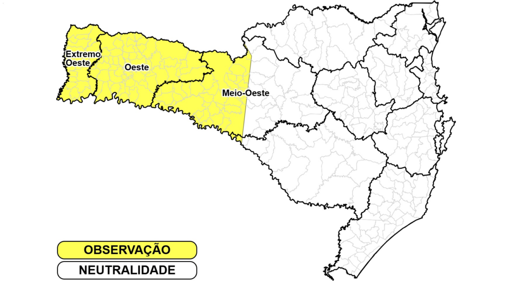 Nas demais áreas do estado, a frente fria tem uma maior influência, derrubando mais as temperaturas. Entre a Grande Florianópolis, Vale do Itajaí, Litoral Norte e os Planaltos, os termômetros variam entre os 26 a 28°C entre este sábado e a segunda-feira.