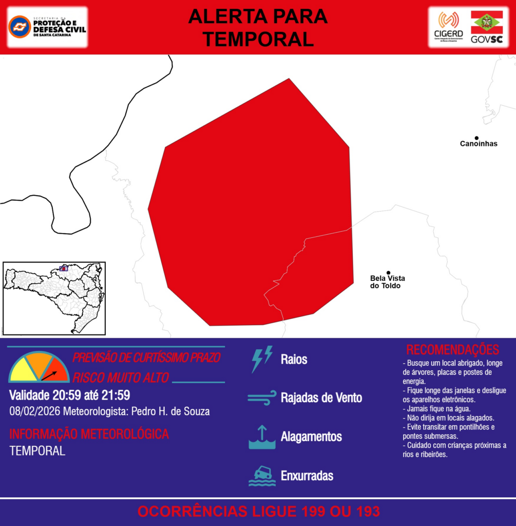 ALERTA – 08/02 20:59 – TEMPORAL com RAIOS, RAJADAS DE VENTO, ALAGAMENTOS e risco de ENXURRADAS para os municípios de Bela Vista do Toldo e Canoinhas na próxima hora. Ocorrências ligue 199 ou 193.