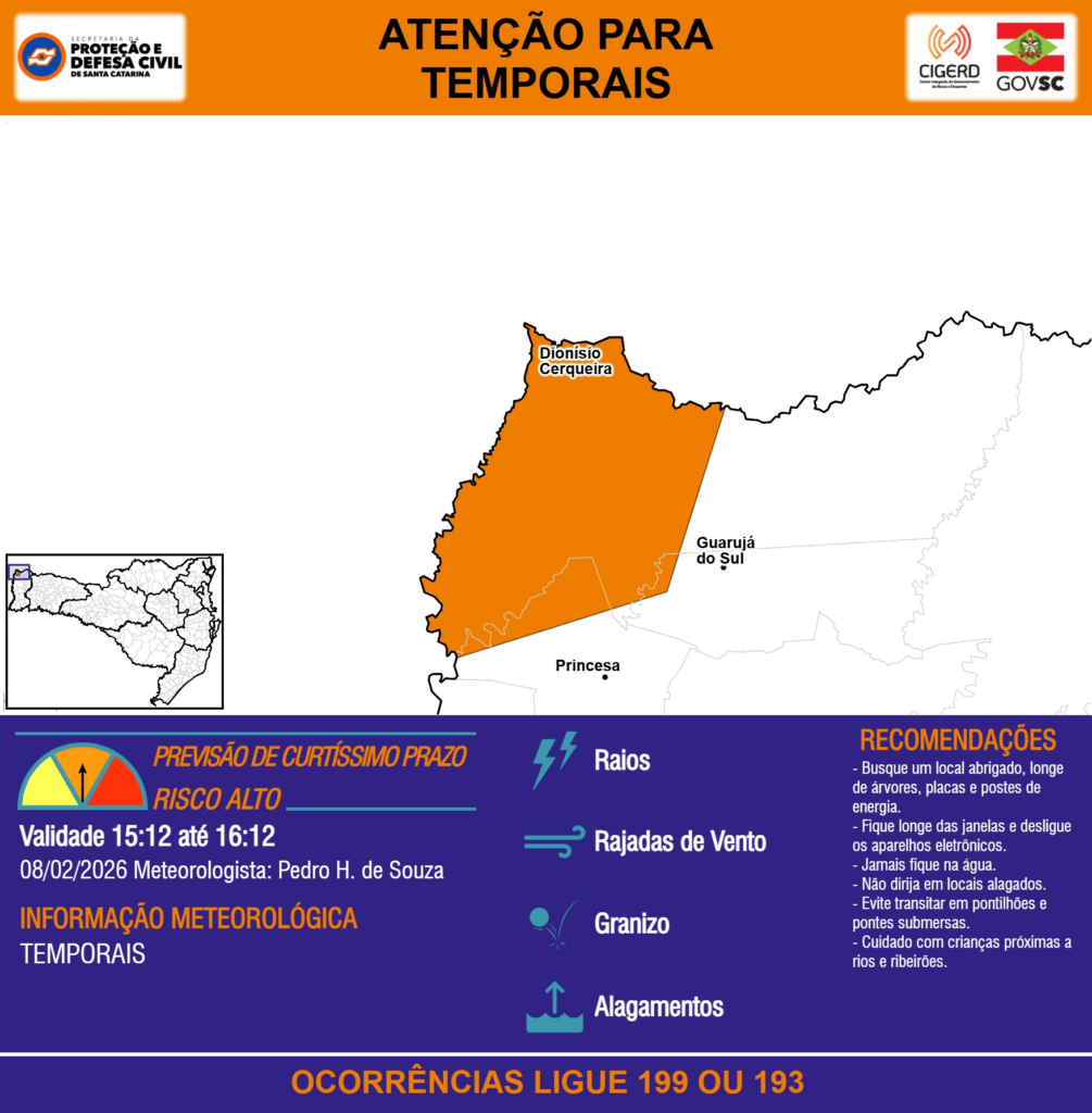 ATENÇÃO – 08/02 15:12 – TEMPORAIS com RAIOS, RAJADAS DE VENTO, GRANIZO e ALAGAMENTOS para os municípios de Dionísio Cerqueira, Guarujá do Sul e Princesa na próxima hora. Ocorrências ligue 199 ou 193.