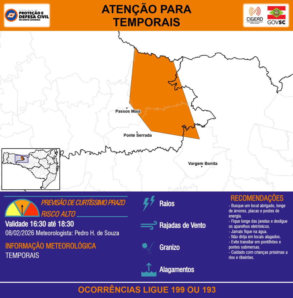 ATENÇÃO – 08/02 16:30 – TEMPORAIS com RAIOS, RAJADAS DE VENTO, GRANIZO e ALAGAMENTOS para áreas dos municípios de Passos Maia, Ponte Serrada e Vargem Bonita nas próximas 2 horas. Ocorrências ligue 199 ou 193.