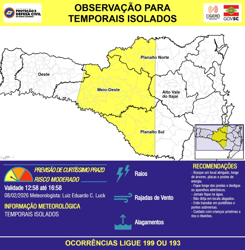 OBSERVAÇÃO – 08/02 12:58 – TEMPORAIS ISOLADOS com RAIOS, RAJADAS DE VENTO e ALAGAMENTOS pontuais para as regiões do Oeste, Meio-Oeste, Planalto Norte, Planalto Sul e Alto Vale do Itajaí nas próximas 4 horas. Ocorrências ligue 199 ou 193.