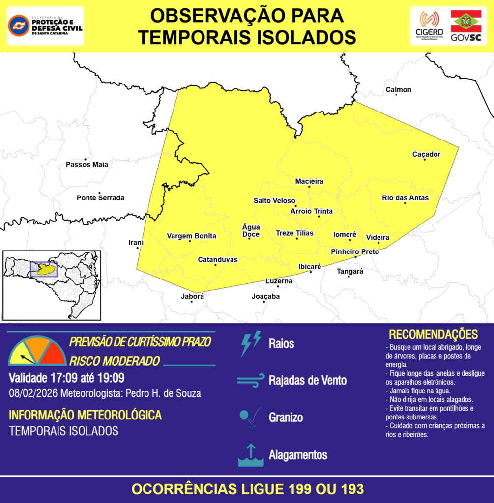 OBSERVAÇÃO – 08/02 17:09 – TEMPORAIS ISOLADOS com RAIOS, RAJADAS DE VENTO, GRANIZO e ALAGAMENTOS pontuais para áreas das regiões do Oeste e Meio-Oeste nas próximas 2 horas. Ocorrências ligue 199 ou 193.