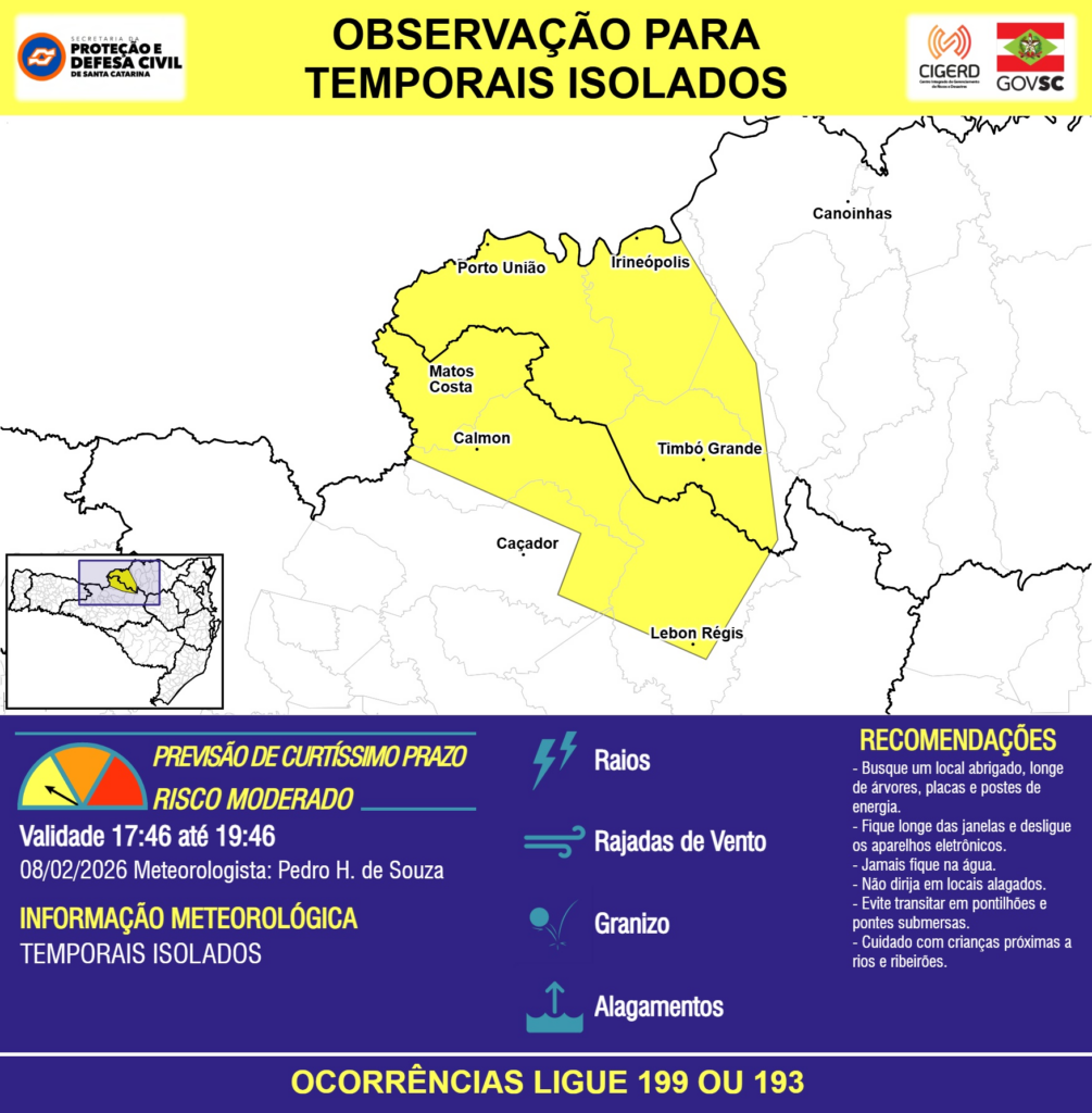 OBSERVAÇÃO – 08/02 17:46 – TEMPORAIS ISOLADOS com RAIOS, RAJADAS DE VENTO, GRANIZO e ALAGAMENTOS pontuais para áreas das regiões do Meio-Oeste e Planalto Norte nas próximas 2 horas. Ocorrências ligue 199 ou 193.
