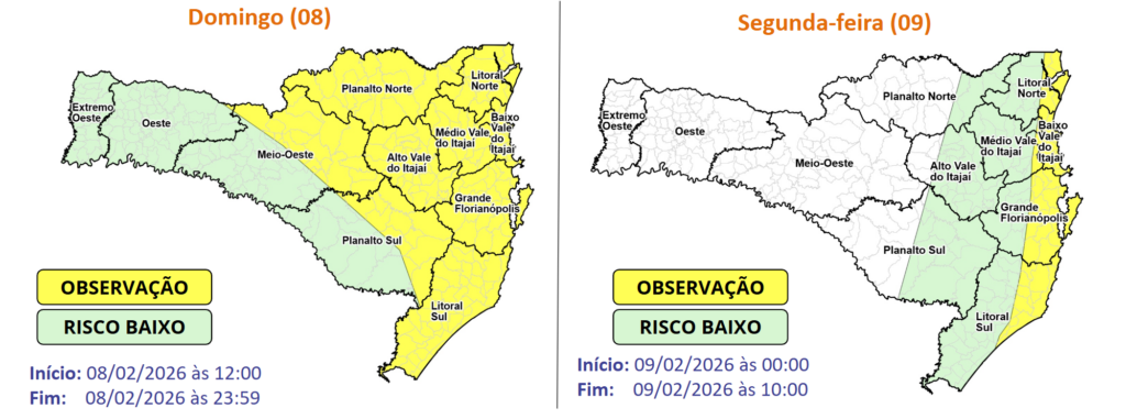 Os temporais iniciam ao longo da tarde de domingo nos Planaltos, especialmente nas áreas de divisa com o PR, e avançam em direção ao litoral no decorrer da tarde e início da noite. Há condições para temporais com raios, rajadas de vento e chuva pontualmente intensa.