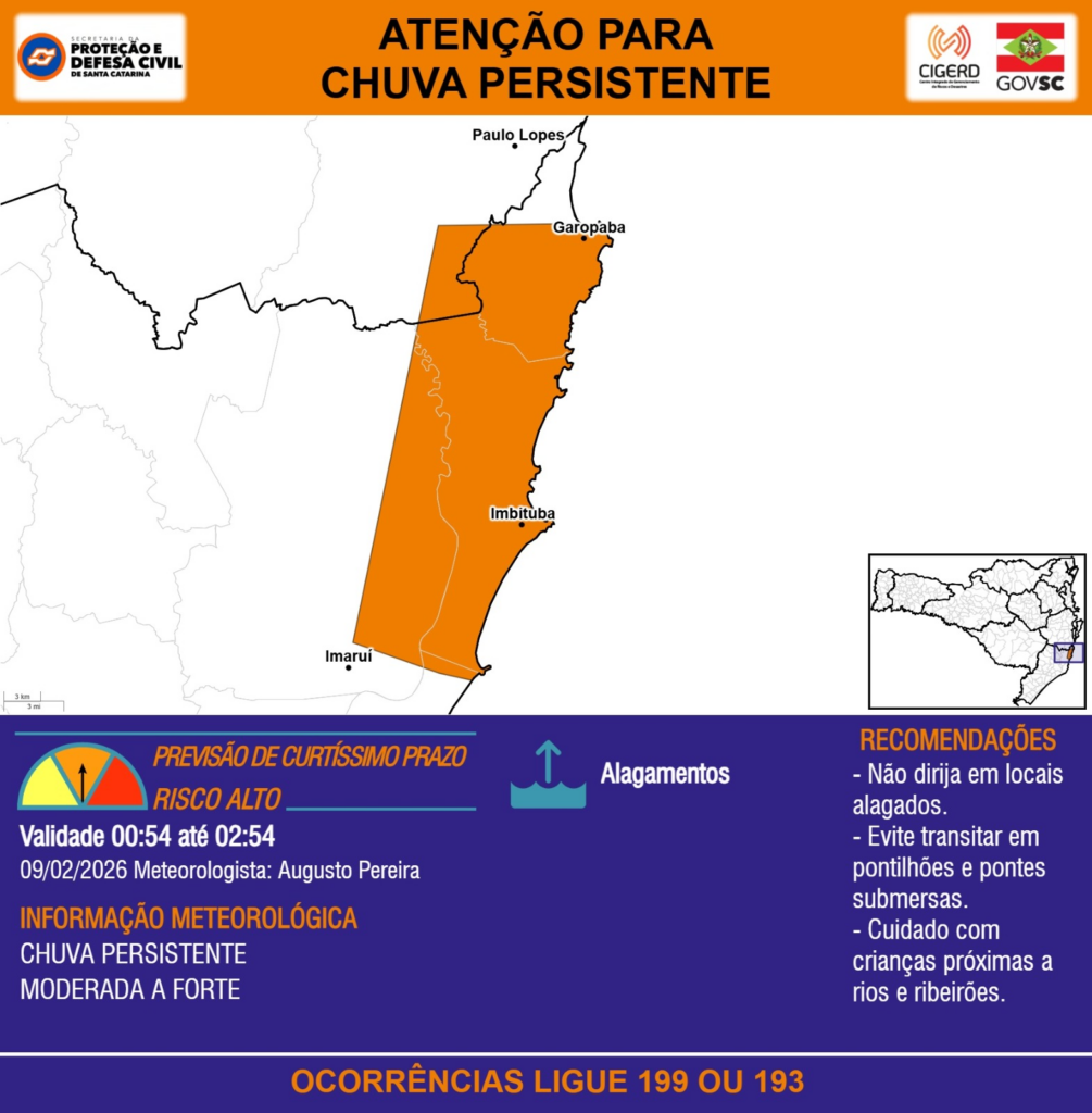 ATENÇÃO – 09/02 00:54 – CHUVA PERSISTENTE de intensidade moderada a forte com ALAGAMENTOS para os municípios de Garopaba, Imaruí, Imbituba e Paulo Lopes nas próximas 2 horas. Ocorrências ligue 199 ou 193.