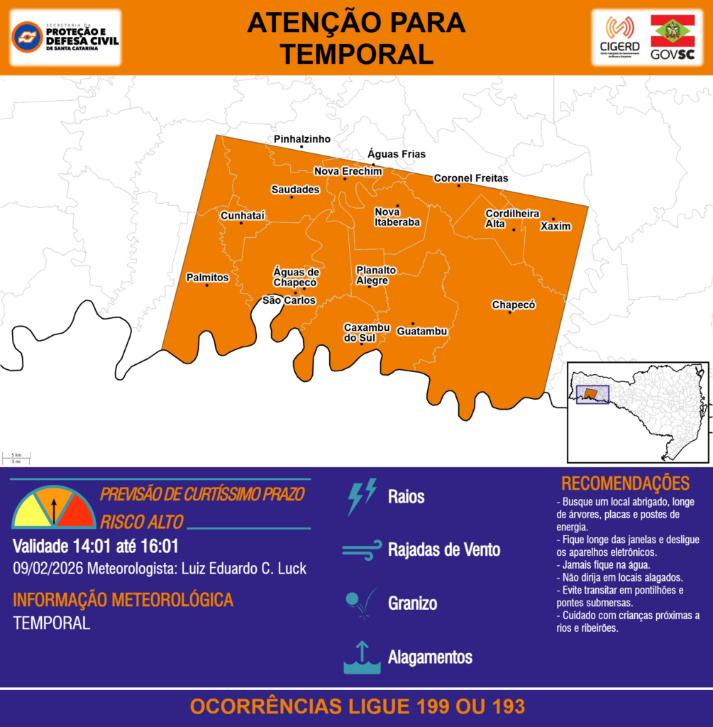 ATENÇÃO – 09/02 14:01 – TEMPORAL com RAIOS, RAJADAS DE VENTO, GRANIZO e ALAGAMENTOS para os municípios de Caxambu do Sul, Chapecó, Cordilheira Alta, Coronel Freitas, Cunhataí, Guatambu, Nova Erechim, Nova Itaberaba, Palmitos, Pinhalzinho, Planalto Alegre, Saudades, São Carlos, Xaxim, Águas Frias e Águas de Chapecó nas próximas 2 horas. Ocorrências ligue 199 ou 193.