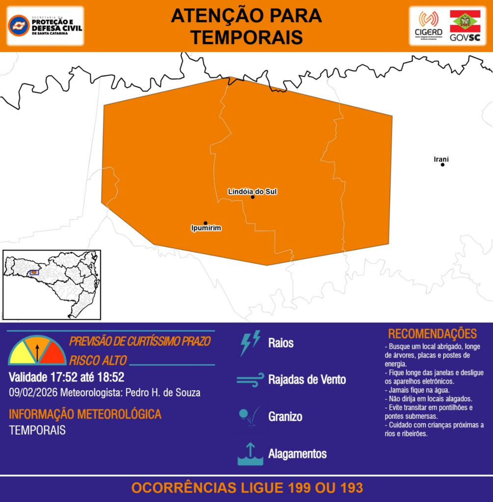 ATENÇÃO – 09/02 17:52 – TEMPORAIS com RAIOS, RAJADAS DE VENTO, GRANIZO e ALAGAMENTOS para os municípios de Ipumirim, Irani e Lindóia do Sul na próxima hora. Ocorrências ligue 199 ou 193.