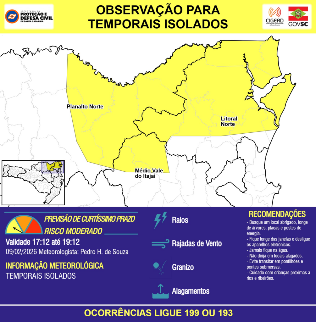 OBSERVAÇÃO – 09/02 17:12 – TEMPORAIS ISOLADOS com RAIOS, RAJADAS DE VENTO, GRANIZO e ALAGAMENTOS pontuais para áreas das regiões do Planalto Norte, Litoral Norte e Médio Vale do Itajaí nas próximas 2 horas. Ocorrências ligue 199 ou 193.