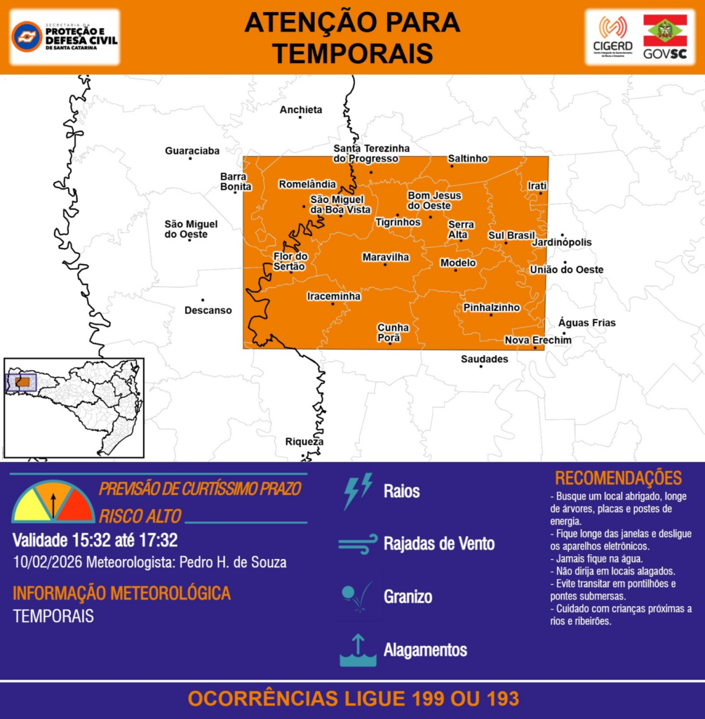 ATENÇÃO – 10/02 15:32 – TEMPORAIS com RAIOS, RAJADAS DE VENTO, GRANIZO e ALAGAMENTOS para áreas das regiões do Extremo Oeste e Oeste nas próximas 2 horas. Ocorrências ligue 199 ou 193.