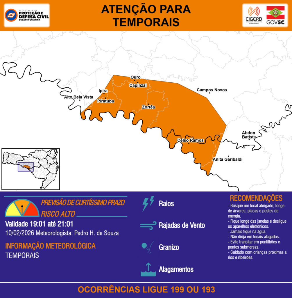 ATENÇÃO – 10/02 19:01 – TEMPORAIS com RAIOS, RAJADAS DE VENTO, GRANIZO e ALAGAMENTOS para os municípios de Abdon Batista, Alto Bela Vista, Anita Garibaldi, Campos Novos, Capinzal, Celso Ramos, Ipira, Ouro, Piratuba e Zortéa nas próximas 2 horas. Ocorrências ligue 199 ou 193.
