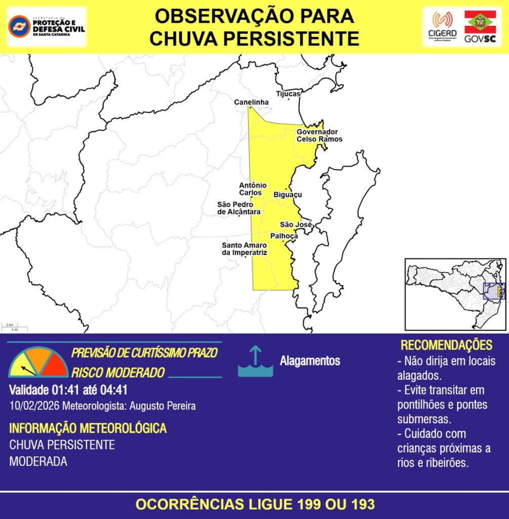 OBSERVAÇÃO – 10/02 01:41 – CHUVA PERSISTENTE de intensidade moderada com ALAGAMENTOS pontuais para os municípios de Antônio Carlos, Biguaçu, Canelinha, Governador Celso Ramos, Palhoça, Santo Amaro da Imperatriz, São José, São Pedro de Alcântara e Tijucas nas próximas 3 horas. Ocorrências ligue 199 ou 193.