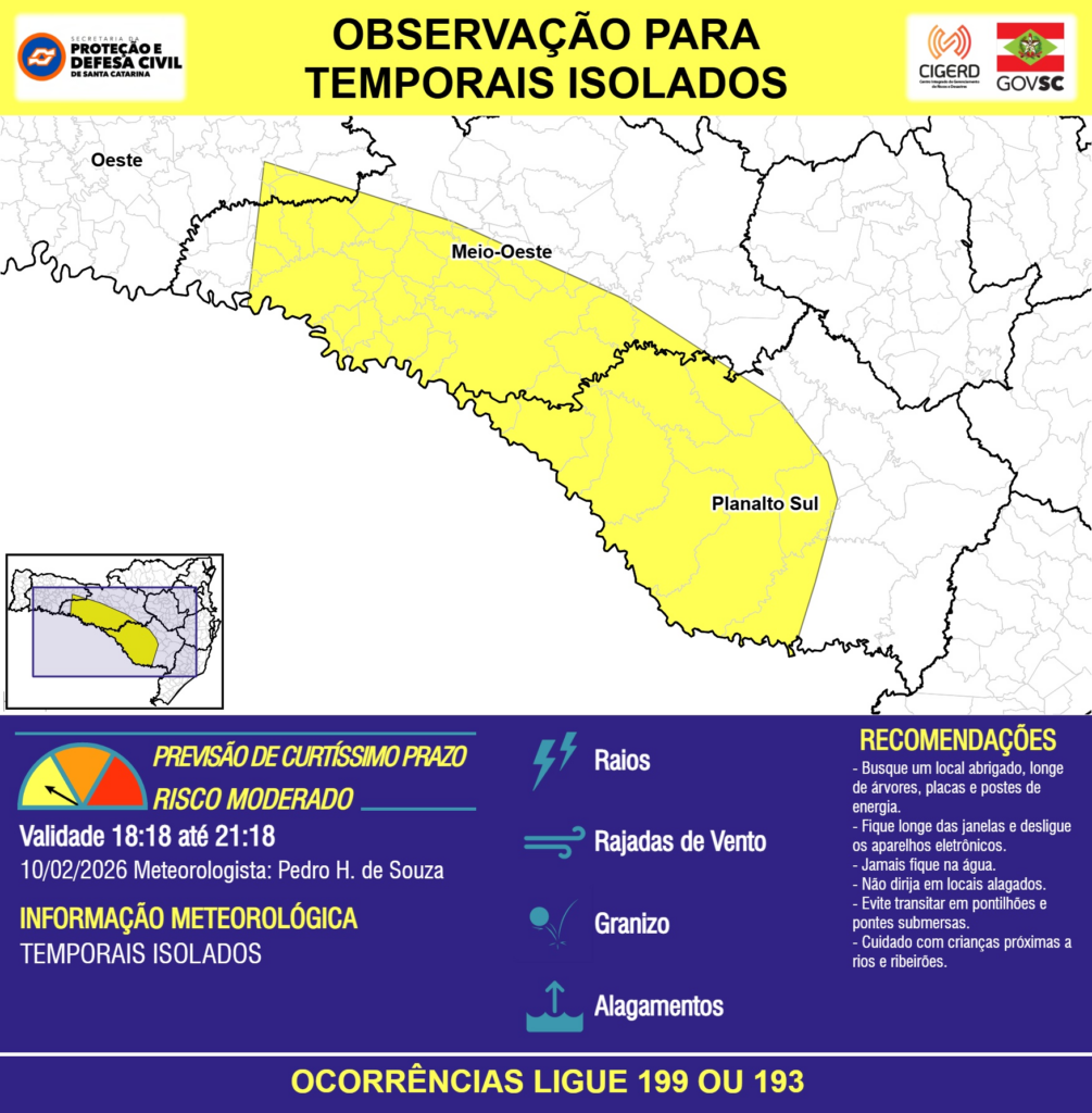 OBSERVAÇÃO – 10/02 18:18 – TEMPORAIS ISOLADOS com RAIOS, RAJADAS DE VENTO, GRANIZO e ALAGAMENTOS pontuais para áreas das regiões do Oeste, Meio-Oeste e Planalto Sul nas próximas 3 horas. Ocorrências ligue 199 ou 193.