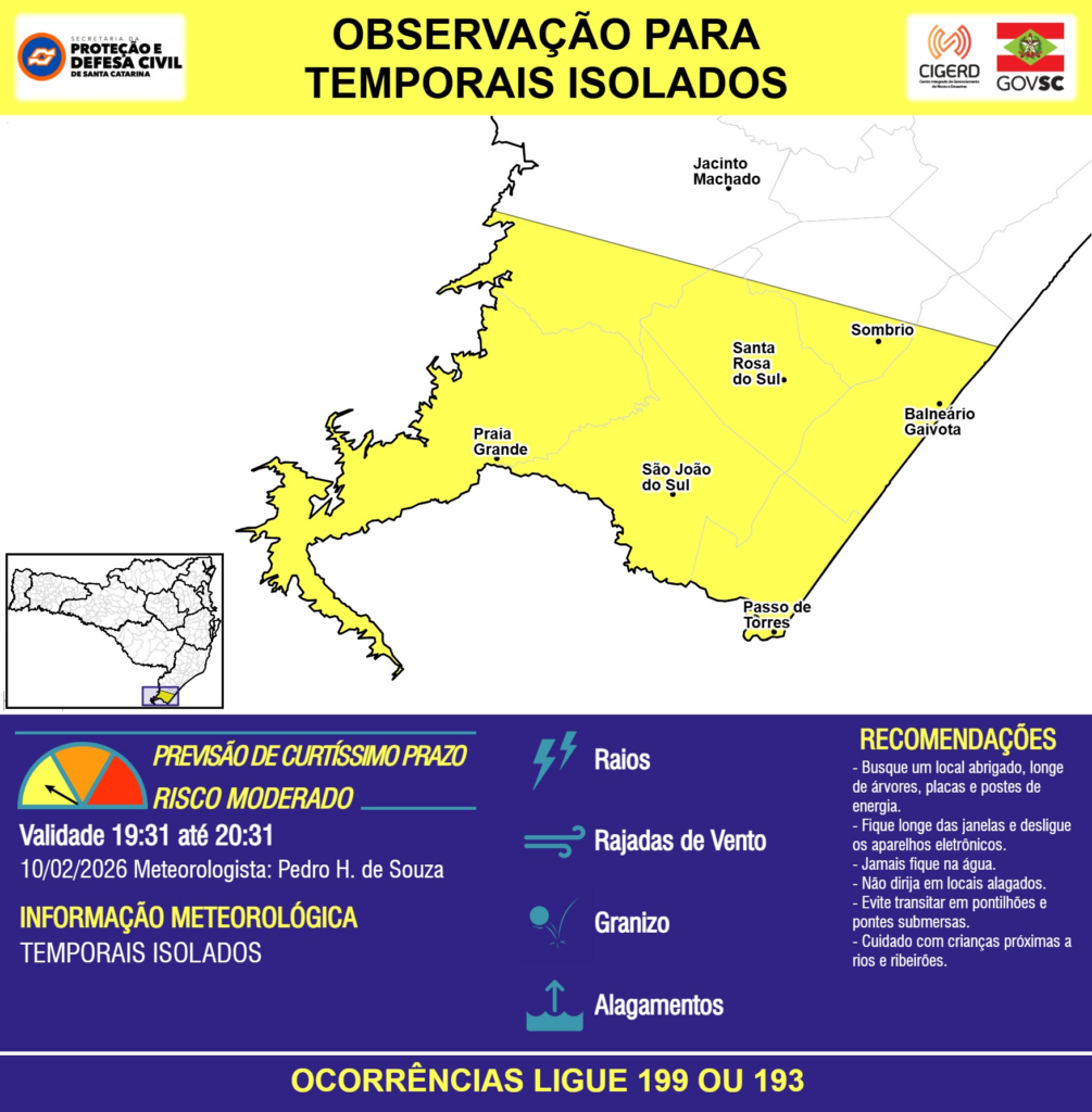 OBSERVAÇÃO – 10/02 19:31 – TEMPORAIS ISOLADOS com RAIOS, RAJADAS DE VENTO, GRANIZO e ALAGAMENTOS pontuais para os municípios de Balneário Gaivota, Jacinto Machado, Passo de Torres, Praia Grande, Santa Rosa do Sul, Sombrio e São João do Sul na próxima hora. Ocorrências ligue 199 ou 193.