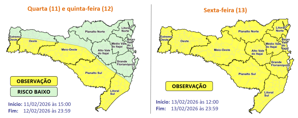 Mas o destaque fica para a sexta-feira (13), devido a passagem de uma frente fria que favorece a formação de temporais mais intensos em comparação aos dias anteriores. Os temporais vêm acompanhados de raios, fortes rajadas de vento e eventual queda de granizo em todo o estado, trazendo risco moderado a alto para ocorrências. Em algumas áreas, principalmente entre o Vale do Itajaí e o Litoral Norte, os volumes podem ser elevados em poucas horas, aumentando o risco de alagamentos e enxurradas.