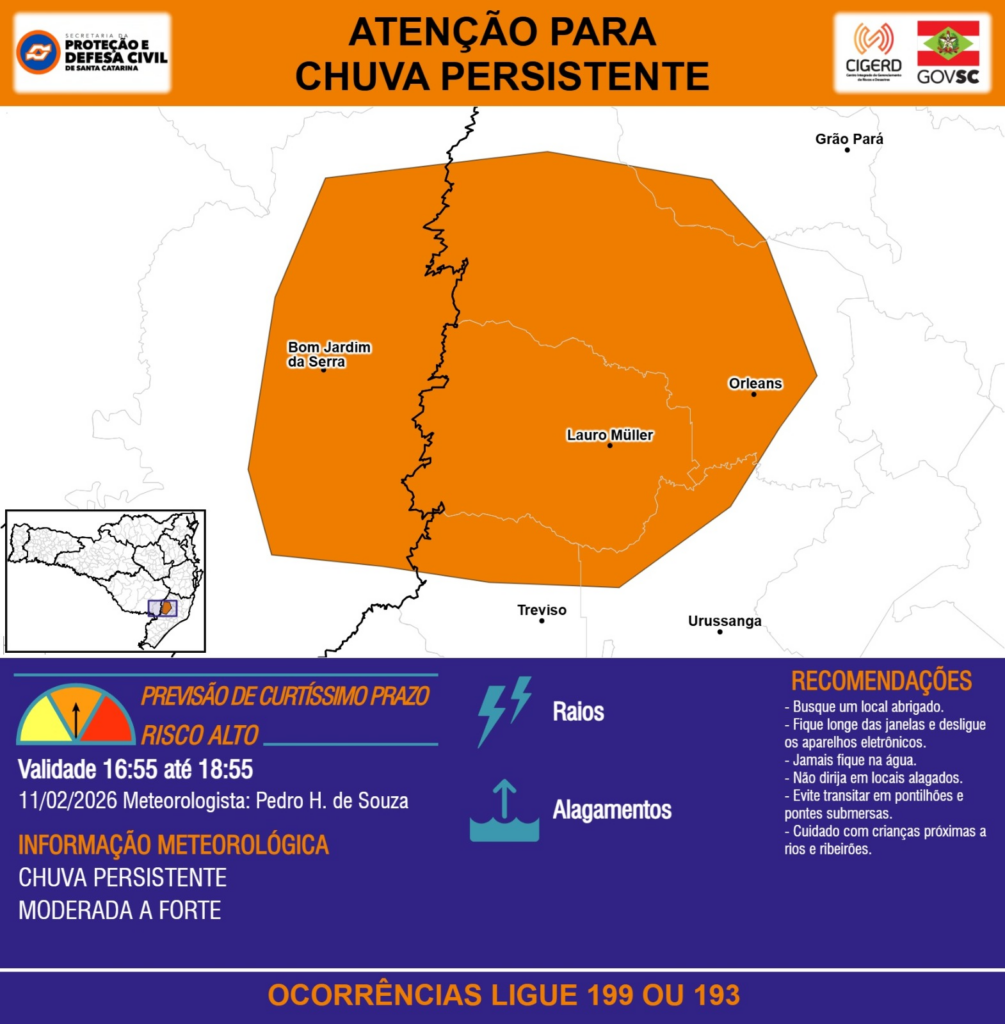 ATENÇÃO – 11/02 16:55 – CHUVA PERSISTENTE de intensidade moderada a forte com RAIOS e ALAGAMENTOS para áreas dos municípios de Bom Jardim da Serra, Grão Pará, Lauro Müller, Orleans, Treviso e Urussanga nas próximas 2 horas. Ocorrências ligue 199 ou 193.