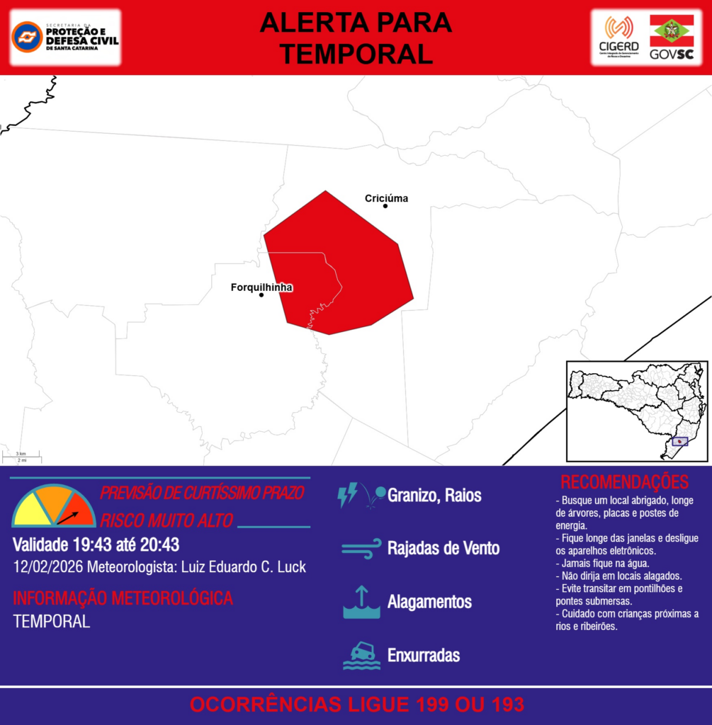 ALERTA – 12/02 19:43 – TEMPORAL com RAJADAS DE VENTO, ALAGAMENTOS, GRANIZO, RAIOS e risco de ENXURRADAS para os municípios de Criciúma, Forquilhinha na próxima hora. Ocorrências ligue 199 ou 193.