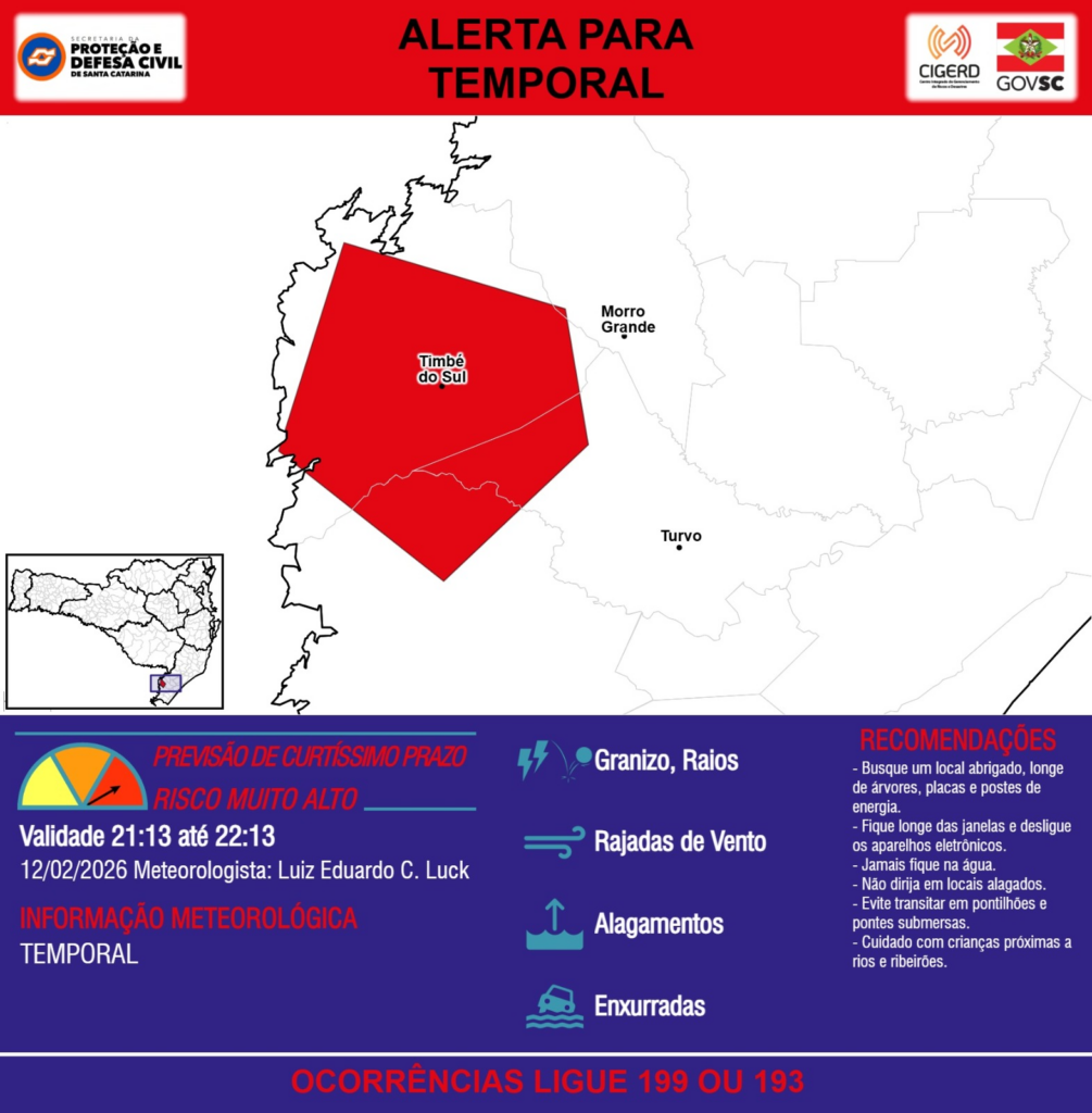 ALERTA – 12/02 21:13 – TEMPORAL com RAJADAS DE VENTO, ALAGAMENTOS, GRANIZO, RAIOS e risco de ENXURRADAS para os municípios de Timbé do Sul e Turvo na próxima hora. Ocorrências ligue 199 ou 193.