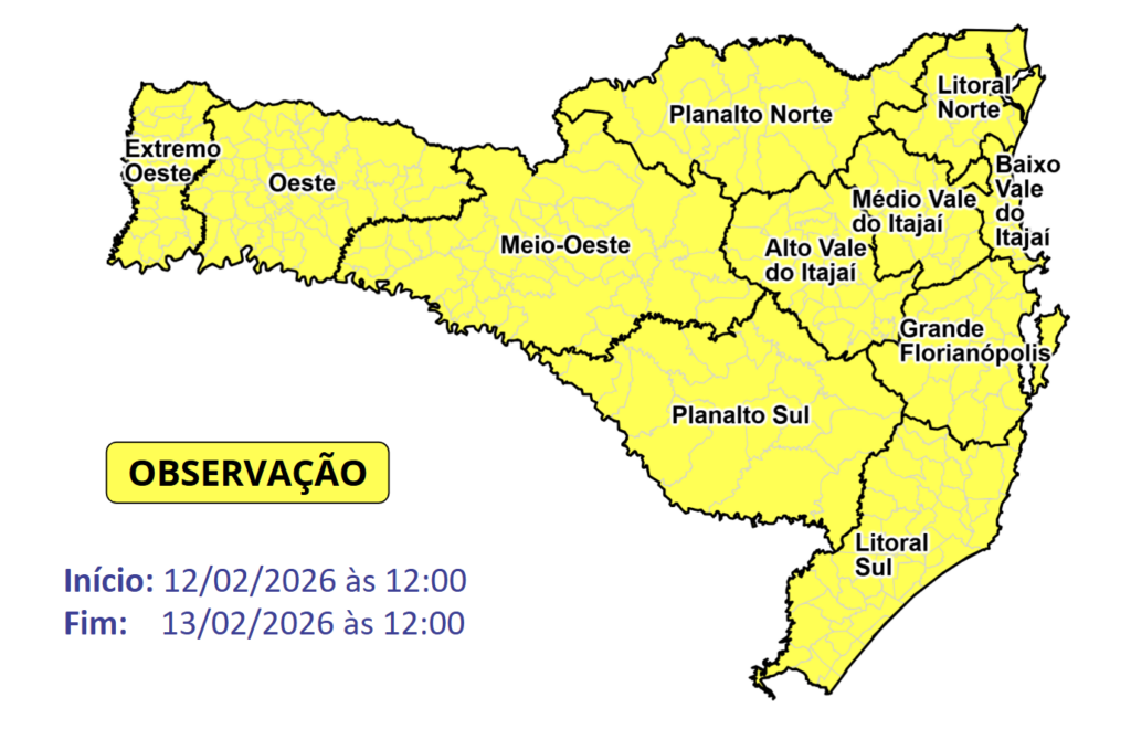 Entre esta quarta (11) e a a manhã de sexta-feira (13), a massa de ar quente continua atuando em Santa Catarina, mantendo as temperaturas elevadas em todas as regiões. No Grande Oeste e no Litoral Sul, as máximas variam entre 34 e 37°C, enquanto nas demais regiões os termômetros oscilam entre 30 e 34°C. Com isso, o risco é moderado para ocorrências associadas ao calor intenso em todo o território catarinense.