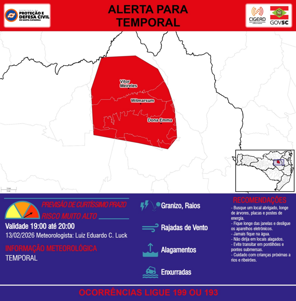 ALERTA – 13/02 19:00 – TEMPORAL com RAJADAS DE VENTO, ALAGAMENTOS, GRANIZO, RAIOS e risco de ENXURRADAS para os municípios de Dona Emma, Vitor Meireles e Witmarsum na próxima hora. Ocorrências ligue 199 ou 193.