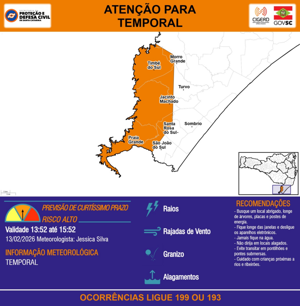 ATENÇÃO – 13/02 13:52 – TEMPORAL com RAIOS, RAJADAS DE VENTO, GRANIZO e ALAGAMENTOS para os municípios de Jacinto Machado, Morro Grande, Praia Grande, Santa Rosa do Sul, Sombrio, São João do Sul, Timbé do Sul e Turvo nas próximas 2 horas. Ocorrências ligue 199 ou 193.