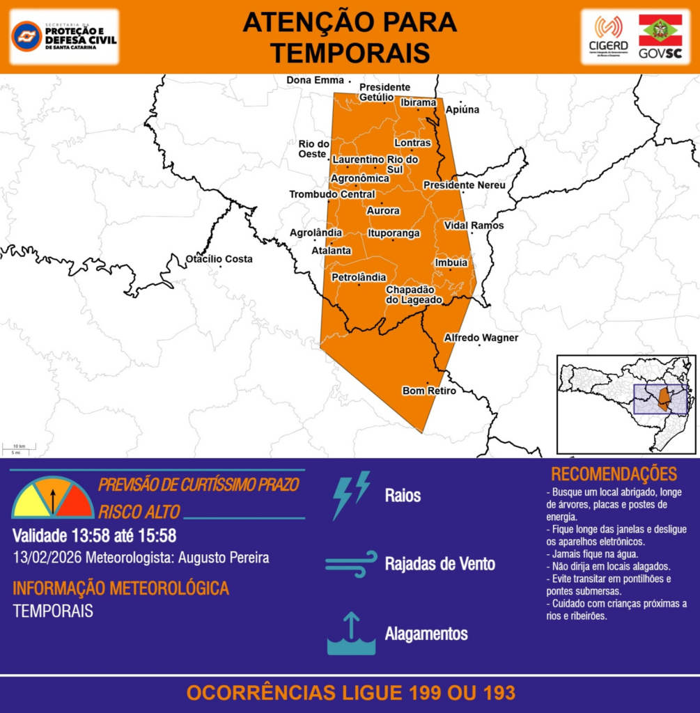 ATENÇÃO – 13/02 13:58 – TEMPORAIS com RAIOS, RAJADAS DE VENTO e ALAGAMENTOS para os municípios de Agrolândia, Agronômica, Alfredo Wagner, Apiúna, Atalanta, Aurora, Bom Retiro, Chapadão do Lageado, Dona Emma, Ibirama, Imbuia, Ituporanga, Laurentino, Lontras, Otacílio Costa, Petrolândia, Presidente Getúlio, Presidente Nereu, Rio do Oeste, Rio do Sul, Trombudo Central e Vidal Ramos nas próximas 2 horas. Ocorrências ligue 199 ou 193.