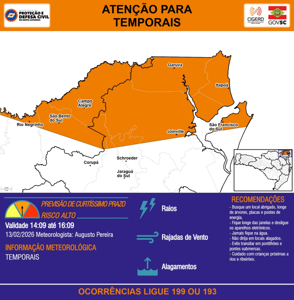 ATENÇÃO – 13/02 14:09 – TEMPORAIS com RAIOS, RAJADAS DE VENTO e ALAGAMENTOS para os municípios de Campo Alegre, Corupá, Garuva, Itapoá, Jaraguá do Sul, Joinville, Rio Negrinho, Schroeder, São Bento do Sul e São Francisco do Sul nas próximas 2 horas. Ocorrências ligue 199 ou 193.