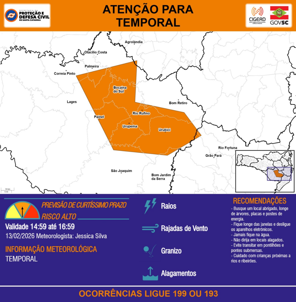 ATENÇÃO – 13/02 14:59 – TEMPORAL com RAIOS, RAJADAS DE VENTO, GRANIZO e ALAGAMENTOS para os municípios de Agrolândia, Bocaina do Sul, Bom Jardim da Serra, Bom Retiro, Correia Pinto, Grão Pará, Lages, Otacílio Costa, Painel, Palmeira, Rio Fortuna, Rio Rufino, São Joaquim, Urubici e Urupema nas próximas 2 horas. Ocorrências ligue 199 ou 193.