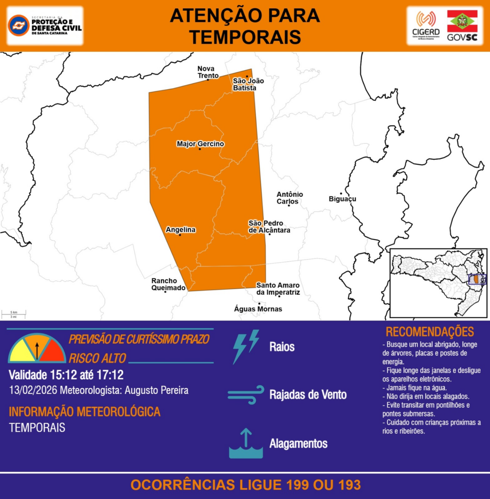 ATENÇÃO – 13/02 15:12 – TEMPORAIS com RAIOS, RAJADAS DE VENTO e ALAGAMENTOS para os municípios de Angelina, Antônio Carlos, Biguaçu, Major Gercino, Nova Trento, Rancho Queimado, Santo Amaro da Imperatriz, São João Batista, São Pedro de Alcântara e Águas Mornas nas próximas 2 horas. Ocorrências ligue 199 ou 193.