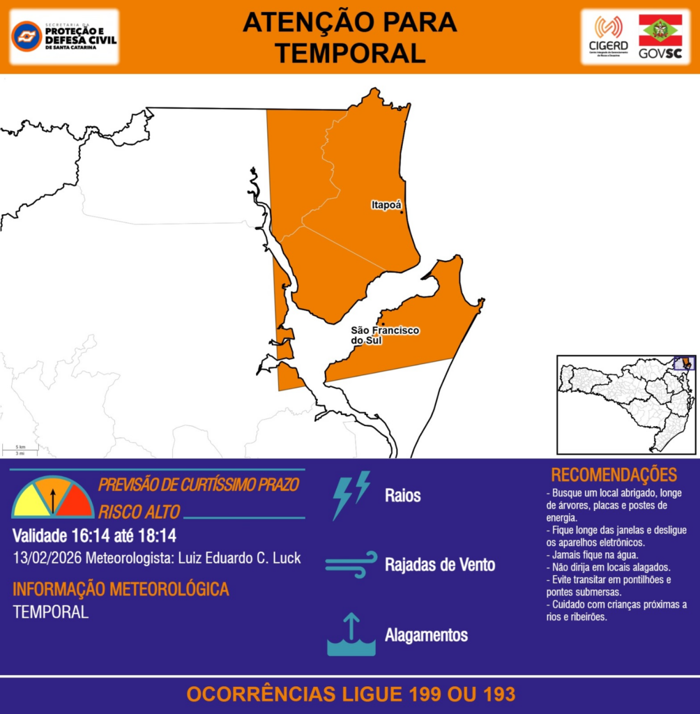 ATENÇÃO – 13/02 16:14 – TEMPORAL com RAIOS, RAJADAS DE VENTO e ALAGAMENTOS para os municípios de Itapoá e São Francisco do Sul nas próximas 2 horas. Ocorrências ligue 199 ou 193.