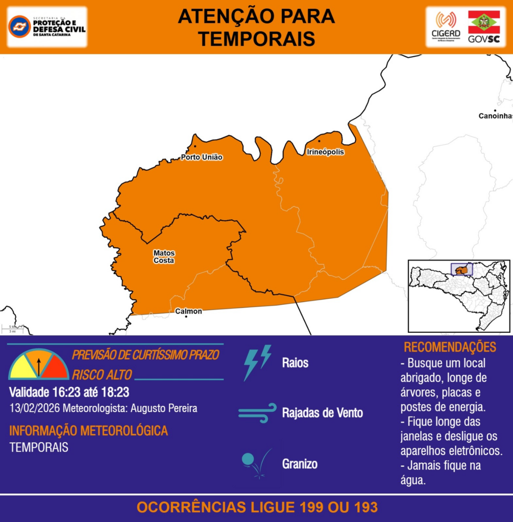 ATENÇÃO – 13/02 16:23 – TEMPORAIS com RAIOS, RAJADAS DE VENTO e GRANIZO para os municípios de Calmon, Canoinhas, Irineópolis, Matos Costa e Porto União nas próximas 2 horas. Ocorrências ligue 199 ou 193.