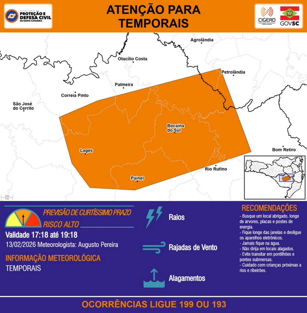 ATENÇÃO – 13/02 17:18 – TEMPORAIS com RAIOS, RAJADAS DE VENTO e ALAGAMENTOS para os municípios de Agrolândia, Bocaina do Sul, Bom Retiro, Correia Pinto, Lages, Otacílio Costa, Painel, Palmeira, Petrolândia, Rio Rufino e São José do Cerrito nas próximas 2 horas. Ocorrências ligue 199 ou 193.
