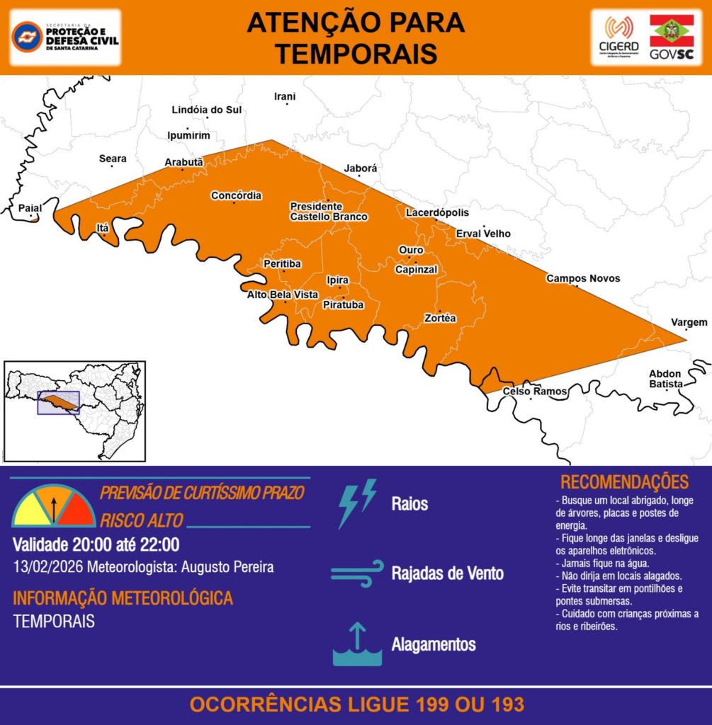 ATENÇÃO – 13/02 20:00 – TEMPORAIS com RAIOS, RAJADAS DE VENTO e ALAGAMENTOS para os municípios de Abdon Batista, Alto Bela Vista, Arabutã, Campos Novos, Capinzal, Celso Ramos, Concórdia, Erval Velho, Ipira, Ipumirim, Irani, Itá, Jaborá, Lacerdópolis, Lindóia do Sul, Ouro, Paial, Peritiba, Piratuba, Presidente Castello Branco, Seara, Vargem e Zortéa nas próximas 2 horas. Ocorrências ligue 199 ou 193.