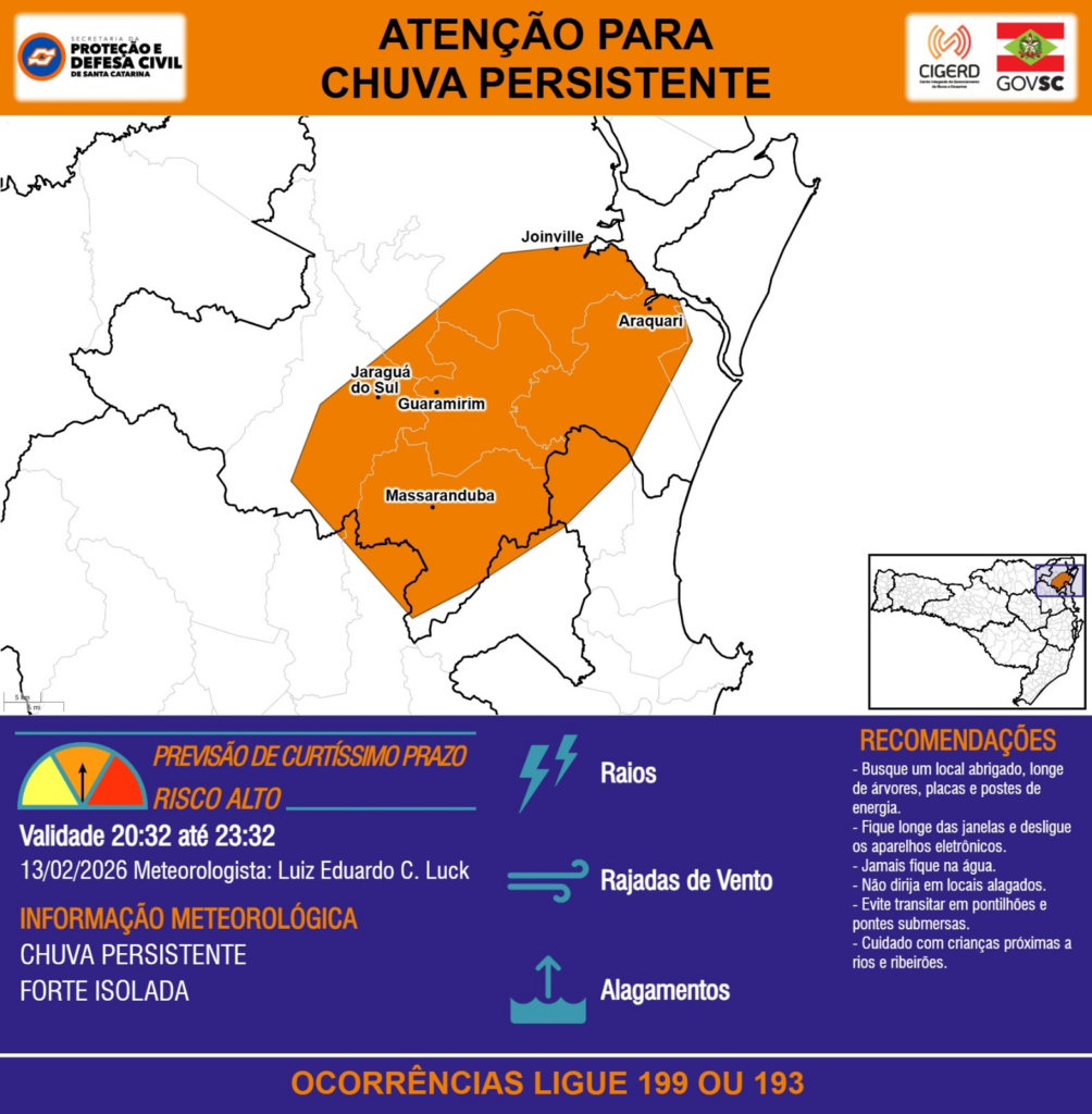 ATENÇÃO – 13/02 20:32 – CHUVA PERSISTENTE de intensidade forte isolada com RAIOS, RAJADAS DE VENTO e ALAGAMENTOS para os municípios de Araquari, Guaramirim, Jaraguá do Sul, Joinville e Massaranduba nas próximas 3 horas. Ocorrências ligue 199 ou 193.