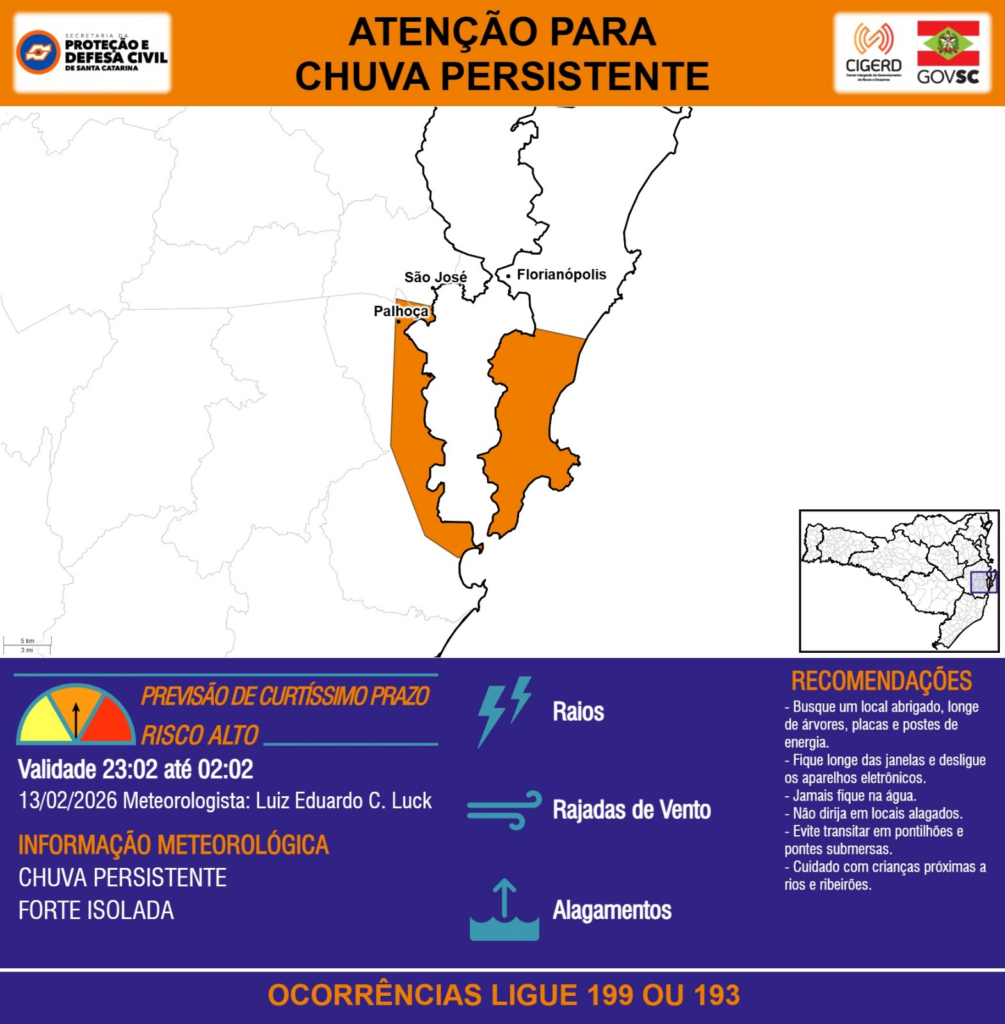 ATENÇÃO – 13/02 23:02 – CHUVA PERSISTENTE de intensidade forte isolada com RAIOS, RAJADAS DE VENTO e ALAGAMENTOS para os municípios de Florianópolis, Palhoça e São José nas próximas 3 horas. Ocorrências ligue 199 ou 193.