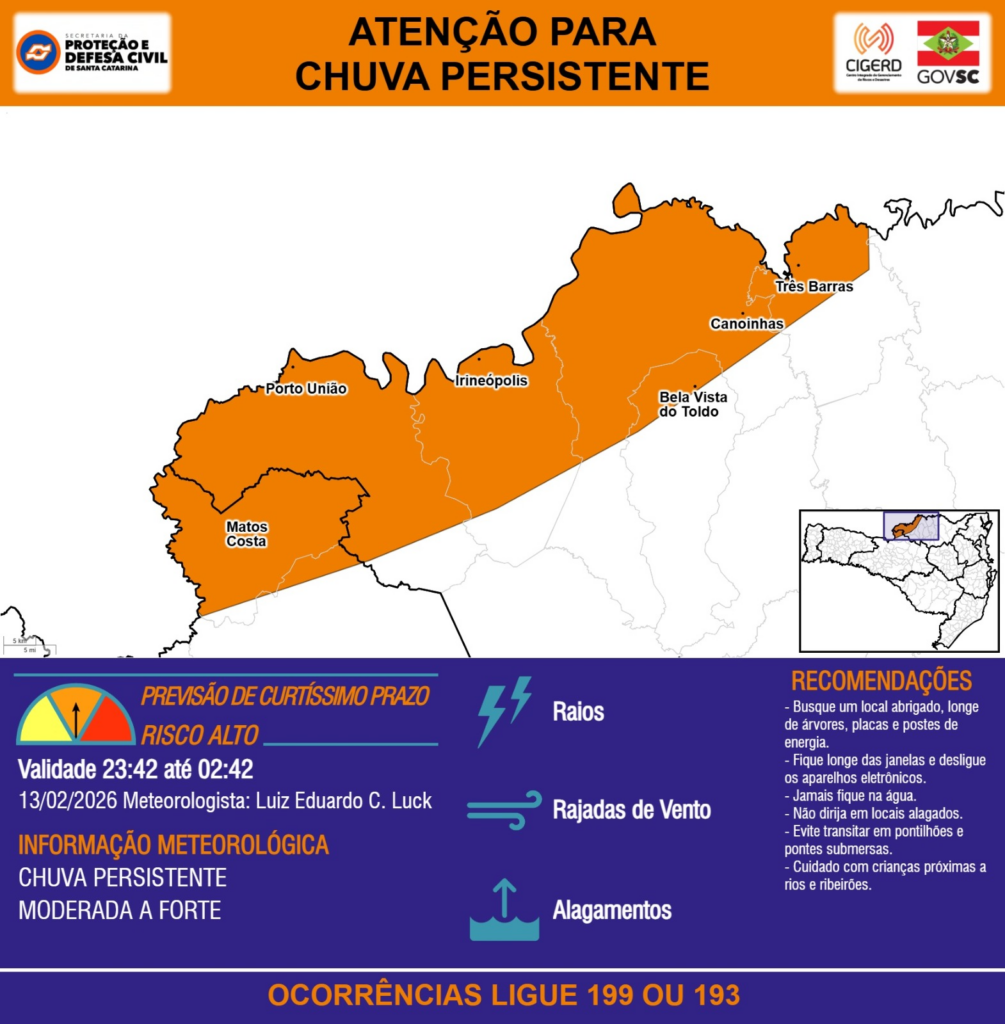 ATENÇÃO – 13/02 23:42 – CHUVA PERSISTENTE de intensidade moderada a forte com RAIOS, RAJADAS DE VENTO e ALAGAMENTOS para os municípios de Bela Vista do Toldo, Canoinhas, Irineópolis, Mafra, Matos Costa, Porto União e Três Barras nas próximas 3 horas. Ocorrências ligue 199 ou 193.