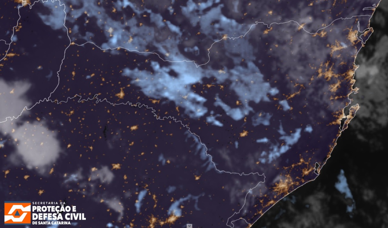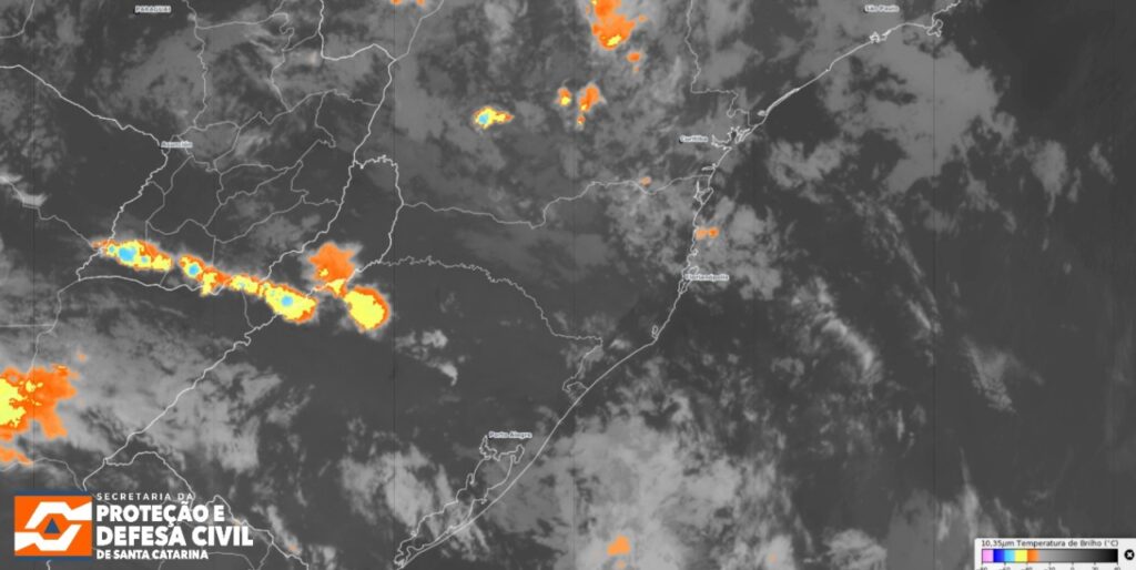 Figura 2: Imagem do satélite GOES-19, canal 13 Infravermelho, às 05h10 horário local. Fonte: CPTEC/INPE, adaptado por SDC/SC.