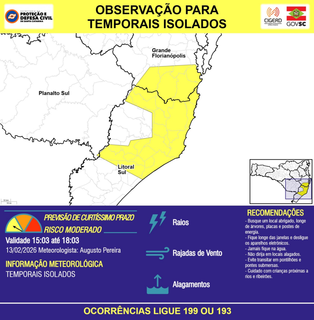 OBSERVAÇÃO – 13/02 15:03 – TEMPORAIS ISOLADOS com RAIOS, RAJADAS DE VENTO e ALAGAMENTOS pontuais para as regiões do Planalto Sul, Litoral Sul e Grande Florianópolis nas próximas 3 horas. Ocorrências ligue 199 ou 193.