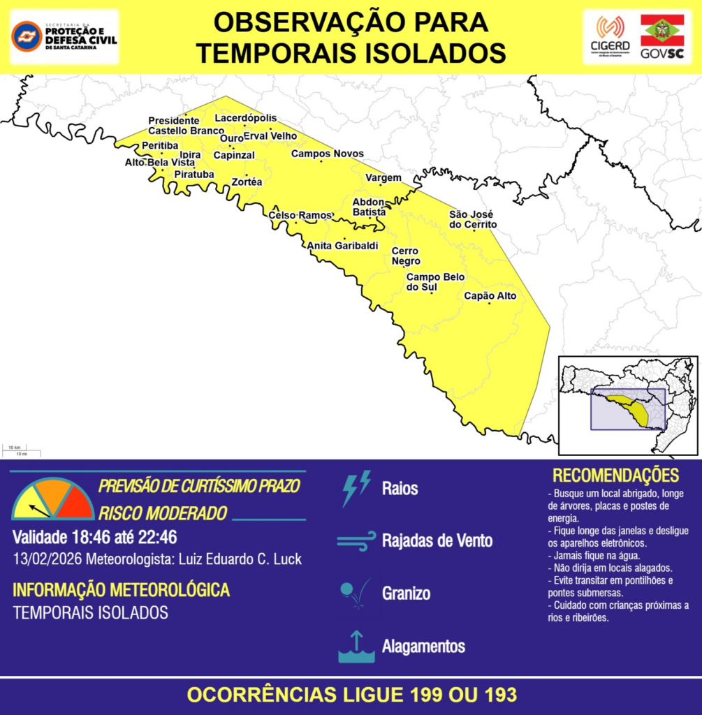 OBSERVAÇÃO – 13/02 18:46 – TEMPORAIS ISOLADOS com RAIOS, RAJADAS DE VENTO, GRANIZO e ALAGAMENTOS pontuais para os municípios de Abdon Batista, Alto Bela Vista, Anita Garibaldi, Campo Belo do Sul, Campos Novos, Capinzal, Capão Alto, Celso Ramos, Cerro Negro, Erval Velho, Ipira, Lacerdópolis, Ouro, Peritiba, Piratuba, Presidente Castello Branco, São Joaquim, São José do Cerrito, Vargem e Zortéa nas próximas 4 horas. Ocorrências ligue 199 ou 193.