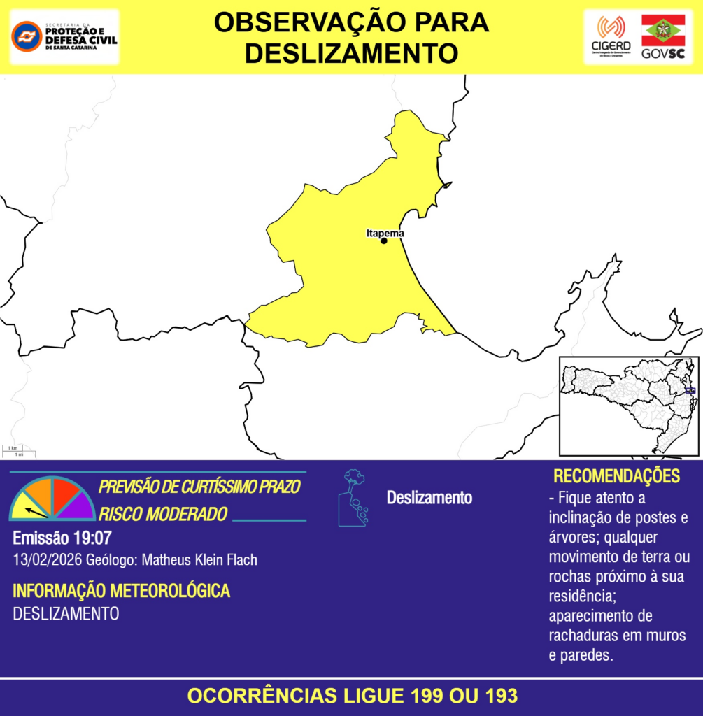 OBSERVAÇÃO – 13/02 19:07 – DESLIZAMENTO para o município de Itapema. Ocorrências ligue 199 ou 193.