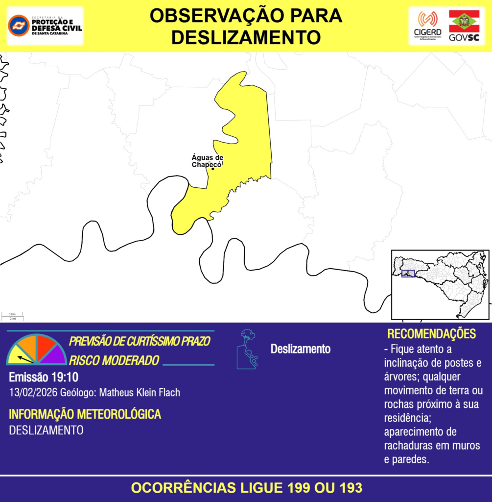 OBSERVAÇÃO – 13/02 19:10 – DESLIZAMENTO para o município de Águas de Chapecó. Ocorrências ligue 199 ou 193.