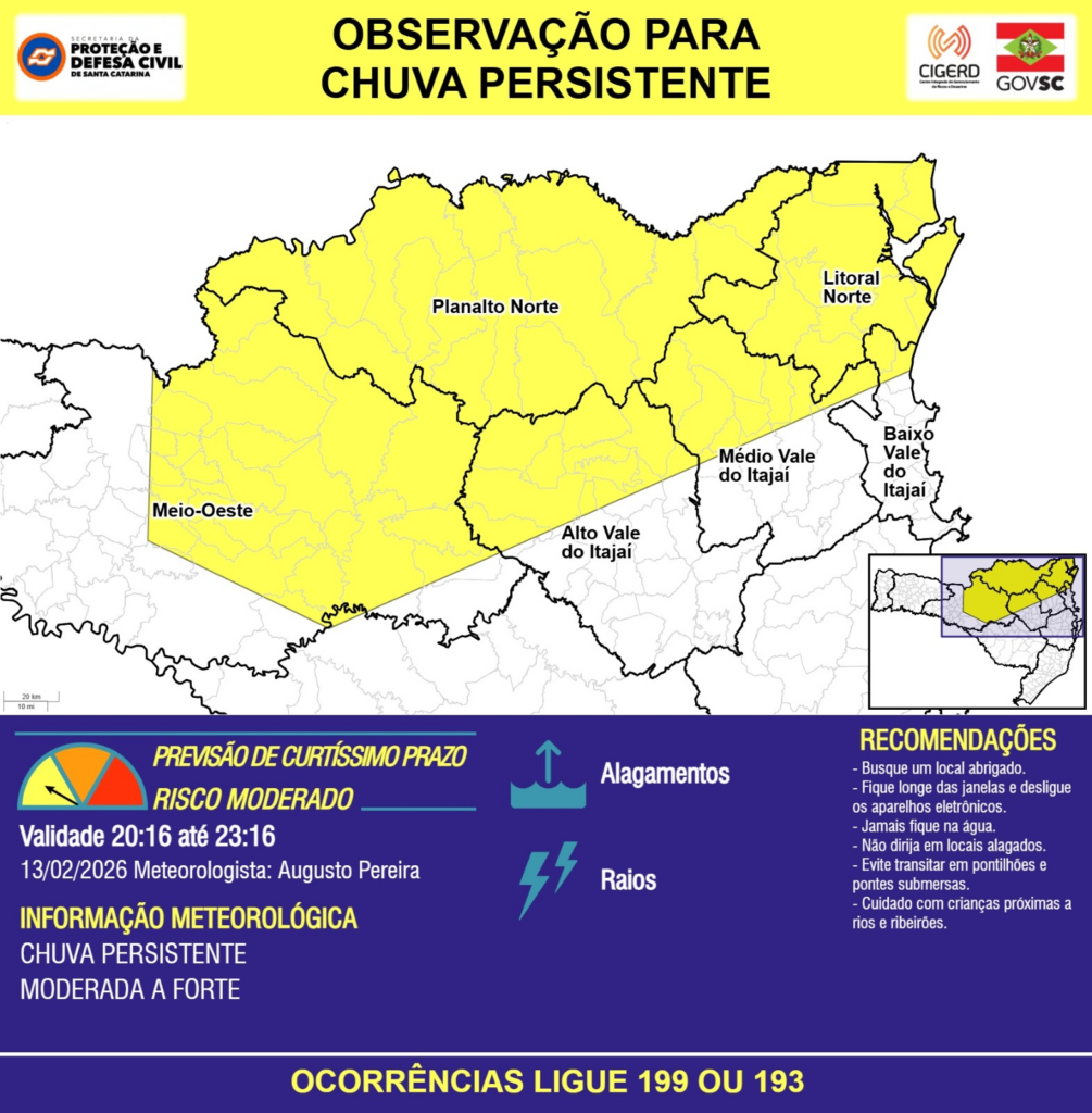 OBSERVAÇÃO – 13/02 20:16 – CHUVA PERSISTENTE de intensidade moderada a forte com RAIOS e ALAGAMENTOS pontuais para as regiões do Meio-Oeste, Planalto Norte, Litoral Norte, Planalto Sul, Baixo, Médio e Alto Vale do Itajaí nas próximas 3 horas. Ocorrências ligue 199 ou 193.