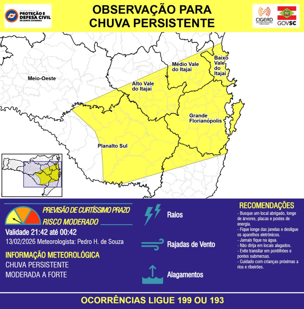 OBSERVAÇÃO – 13/02 21:42 – CHUVA PERSISTENTE de intensidade moderada a forte com RAIOS, RAJADAS DE VENTO e ALAGAMENTOS pontuais para áreas das regiões do Meio-Oeste, Planalto Sul, Litoral Sul, Grande Florianópolis, Baixo, Médio e Alto Vale do Itajaí nas próximas 3 horas. Ocorrências ligue 199 ou 193.