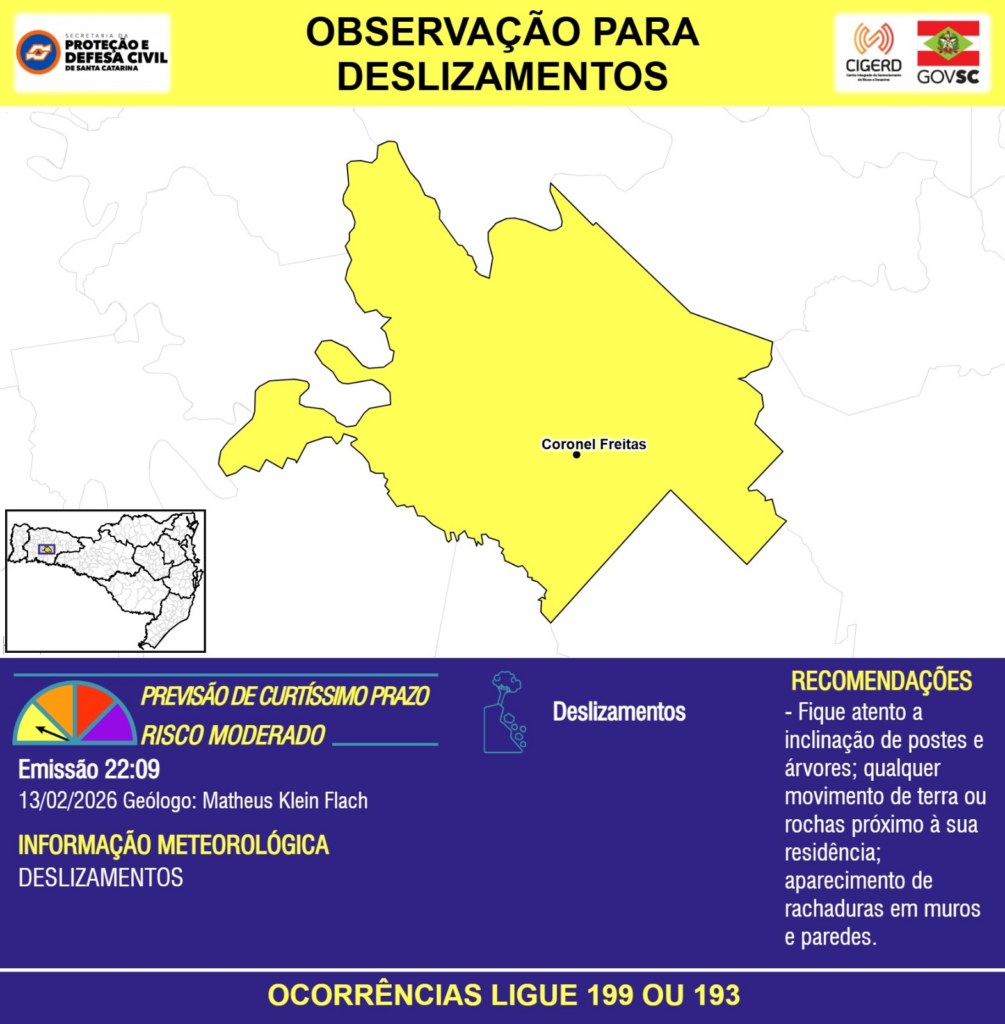 OBSERVAÇÃO – 13/02 22:09 – DESLIZAMENTOS para o município de Coronel Freitas. Ocorrências ligue 199 ou 193.